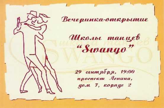 На замечательной вечеринке - открытии школы многочисленные гости стали свидетелями показательных выступлений учителей и учеников школы, по достоинству оценили уютные залы, комфортные раздевалки и прекрасную звуковую аппаратуру. На вечеринке звучала самая разнообразная музыка: свинг, танго немного латины. Именно эти направления современного социального танца будут представлены в расписании занятий Swango. В импровизированном кафе можно было потанцевать под живую музыку джазового трио.